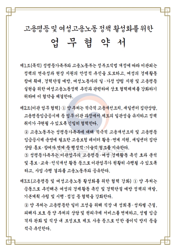 고용노동부-성평등가족부, 고용평등과 여성고용노동 정책 활성화를 위한 업무협약 체결