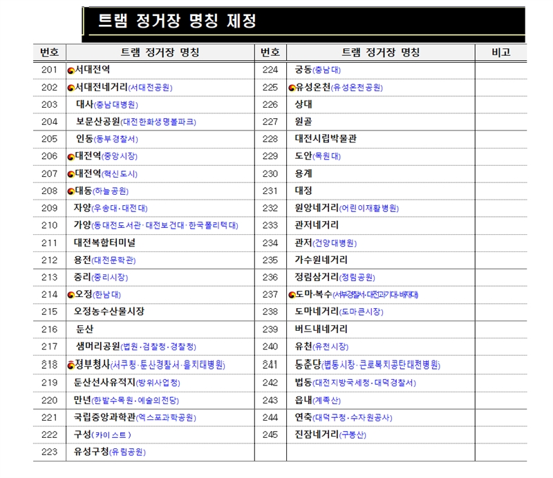 대전시는 도시철도 2호선 트램 정거장 45개소에 대해 정거장 명칭을 확정 고시하였다. 이는 2028년 개통 예정인 도시철도 시설을 효율적이며 체계적으로 관리하고, 시민들의 이용 편의 증진을 도모하기 위함이다. 대전시는 올해 3월 관련 법령에 따라 제정 기준을 마련하고, 전문가 사전 자문을 받았으며 4월 온・오프라인을