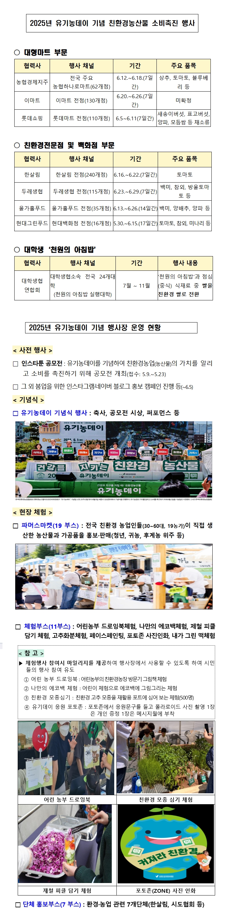 농림축산식품부(이하 농식품부)는 6월 5일(목) 세종시 싱싱장터(도담점)에서 「2025년 유기농데이 기념식」을 개최하고, 6월 한 달간 대대적인 소비촉진 행사를 진행한다고 밝혔다. 올해로 20주년을 맞이한 유기농데이(6월 2일[유기])는 친환경 농업의 가치를 널리 알리고 친환경 농산물 소비를 촉진하기 위하여 20