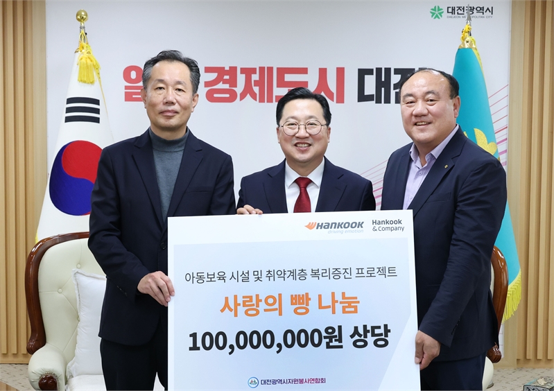 (사)대전광역시자원봉사연합회(회장 김영태)는 29일 ㈜한국타이어앤테크놀로지로부터 지역 내 어려운 이웃을 위한 후원물품(약 9,000만 원 상당의 빵)을 기탁 받았다.이번 기탁식에는 이장우 대전시장, ㈜한국타이어 김주형 문화담당 상무, 박광수 (사)대전광역시자원봉사연합회 부회장 등이 참석했다. (사)대전시자원봉사연합회는