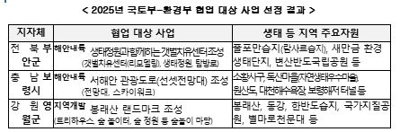□ 국토교통부(장관 김윤덕)와 환경부(장관 김성환)는 ‘지속가능한 지역균형개발 및 생태관광 활성화 연계’ 협업* 사업 대상지로 전북 부안군(생태정원 및 갯벌치유센터), 충남 보령시(선셋전망대), 강원 영월군(봉래산 랜드마크) 등 3곳을 9월 1일자로 최종 확정한다.