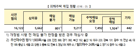 ㅇ ’25년 8월 26일 기준으로 피해자로부터 총 16,122건의 피해주택 매입 사전협의 요청이 들어왔으며, 이 중 9,217건은 현장조사 등 매입 심의가 완료되어 피해자에게 매입이 가능함을 알렸다.
