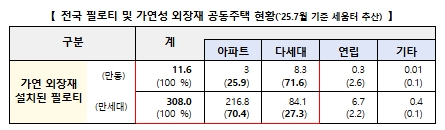 ㅇ 주거용 필로티 건물 28만 동 중 이번 광명 아파트 화재와 같이 불에 잘 타는 가연성 외장재가 설치된 건물은 약 22만 동(78%)이다.