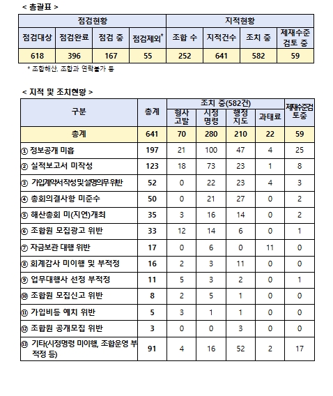 ㅇ 점검대상 618개 조합 중 396곳(64.1%) 점검완료, 이중 252곳에서 위반사항 641건 적발*, 582건 조치 중(59건은 제재수준 검토 중)