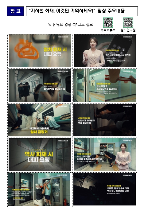 ㅇ 이에, 철도 이용객들이 안전하게 대피하기 위한 방법을 홍보하기 위해 영상을 제작하였으며, 특히 열차가 터널 운행 도중에 화재가 발생*할 경우 화재 진압 및 이용객 대피 등이 제한적이기 때문에 이에 대응한 구체적인 행동요령을 안내하기 위한 내용을 중점적으로 반영했다.