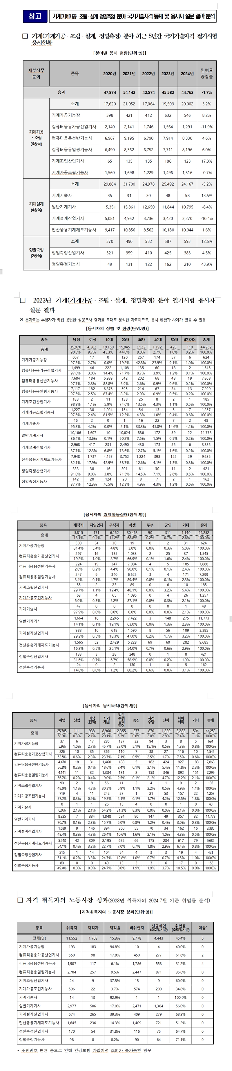 2020년부터 2024년까지 5년간 응시자 데이터를 분석한 결과, 기계 분야 전체 연평균 응시자 수는 약 4만 7천 명, 연평균 –1.7%씩 감소한 것으로 나타났다.