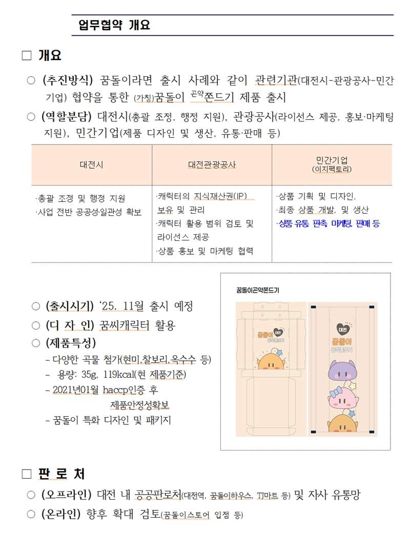 ‘꿈돌이 곤약쫀드기’는 11월 중 꿈돌이와 대전여행, 꿈돌이 하우스, TJ마트 등 대전 내 공공 판로처 및 자사 유통망 중심으로 우선 판매될 예정이다.