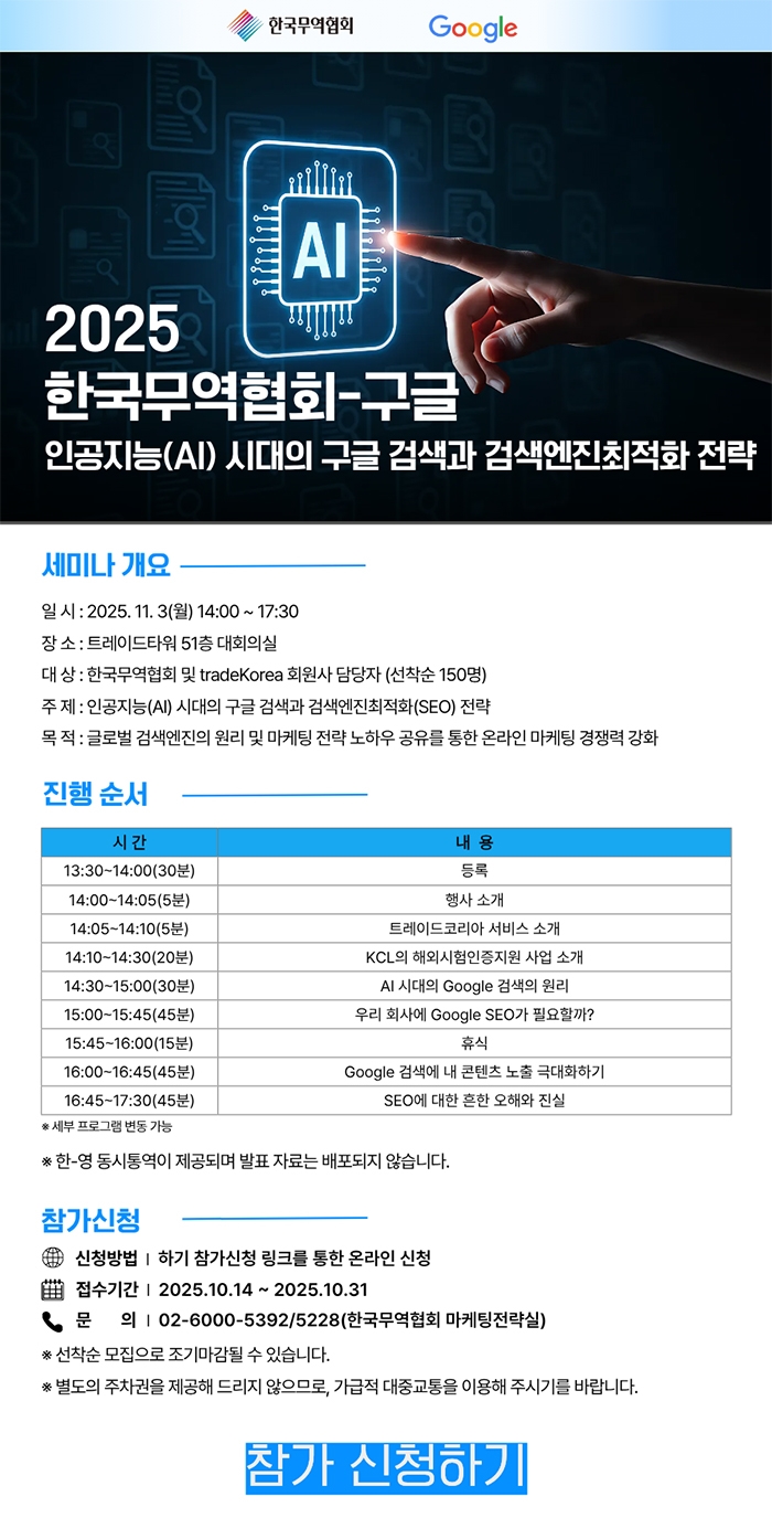 경제 > 유통 2025 한국무역협회-구글 인공지능 시대의 구글 검색과 검색엔진최적화 전략 세미나 월드타임스 승인 2025.10.16 07:26 0 0 0 월드타임스 월드타임스 sun8235050@naver.com 월드타임스의 기사 더보기 저작권자 ⓒ 월드타임스, 무단 전재 및 재배포 금지