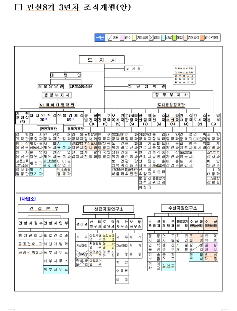 도민 안전 강화와 인공지능(AI) 생태계 구축을 통한 산업 경쟁력 강화, 도민 행복 증진, 스마트팜 집중 육성을 비롯한 농업·농촌 구조 개혁 등에 초점을 맞춰 조직과 인력, 기능을 재조정한다.