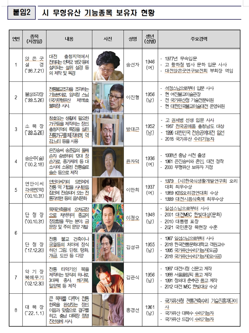 ㅇ (해당종목) 대전의앉은굿(송선자), 불상조각장(이진형), 소목장(방대근),