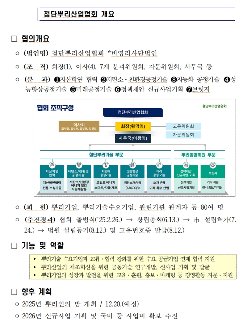 첨단뿌리산업협회는 2025년 2월 출범식을 시작으로, 6월 창립총회를 거쳐 7월 대전광역시 설립허가 및 8월 법원 설립등기를 완료하며 공식 비영리사단법인으로 자리 잡았다.