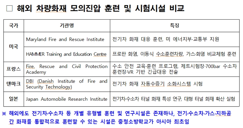 전기차·수소차 등 개별적인 화재 훈련·연구 시설은 세계 각국에 있지만, 전기차와 수소차, 가스, 지하공간 화재 진압 훈련을 통합적으로 실시할 수 있는 곳은 아시아에서 충남이 최초이고, 세계적으로도 드문 것으로 파악되고 있다.