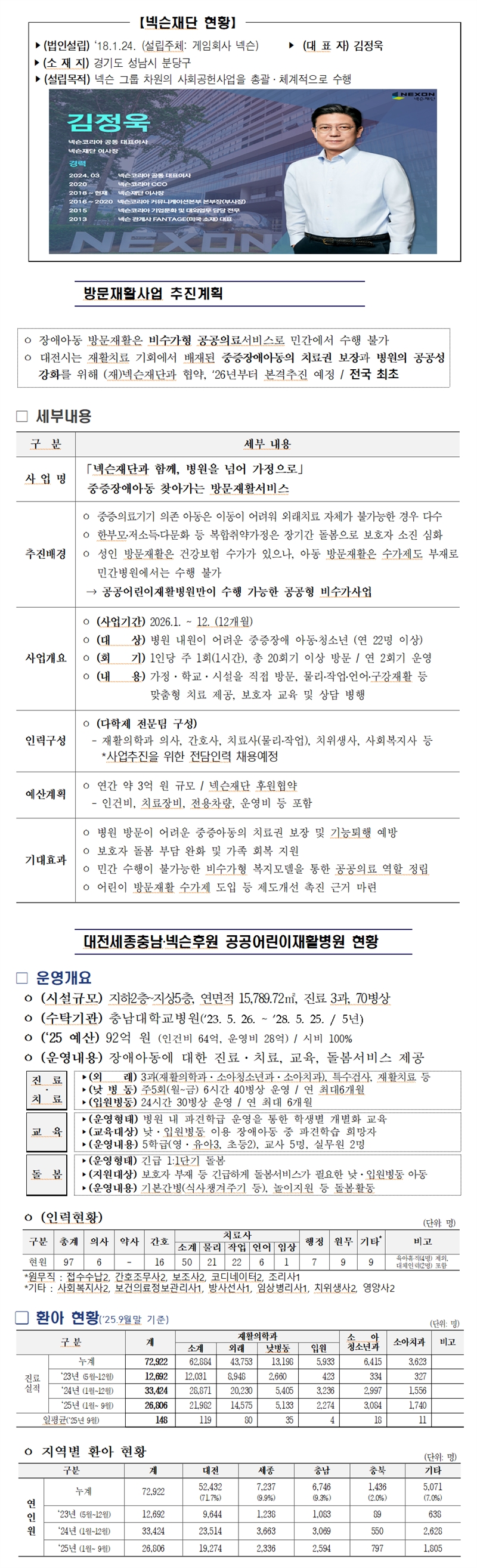 넥슨재단은 사업의 안정적인 정착을 위해 초기 기금 3억 원을 후원하며, 공공어린이재활병원은 해당 기금으로 전담 인력 및 재활장비, 방문 차량 등을 확충해 2026년부터 중증장애아동을 대상으로 연간 약 400회 이상의 통합형 방문재활 서비스를 제공할 예정이다.
