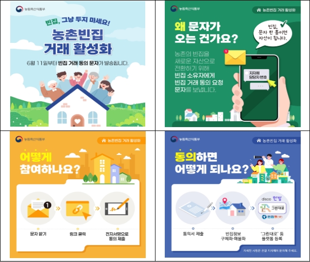 농식품부 박성우 농촌정책국장은 “이번 안내는 방치된 농촌 빈집의 활용을 활성화하는데 중요한 단계이므로, 빈집 소유자 여러분께서는 빈집이 주거, 창업, 여가공간으로 거듭날 수 있도록 빈집은행에 대한 많은 관심과 참여를 부탁드린다”고 밝혔다.