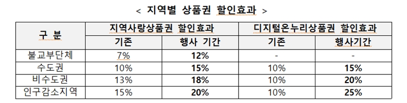 지역사랑상품권이 기존보다 5%p 추가 할인되어, 지역별로 최소 12%에서 최대 20%까지 할인된다. 디지털온누리상품권도 기존 충전할인 10%에 더해 지역별로 5~15%p 특별 환급을 시행한다. 두 상품권 모두 비수도권과 인구감소지역에서 더 크게 할인된다.