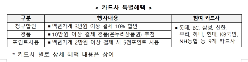한편, 신용·체크카드 사용시 10% 청구할인, 10만원 이상 결제 시 경품 추첨, 포인트 적립 및 사용 등 다양한 카드 특별혜택도 운영된다.