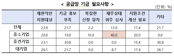 - 특히 공급망기금 지원을 받은 중소기업들은 재무제표 중심의 심사체계를 공급망기금의 가장 큰 애로사항으로 지적