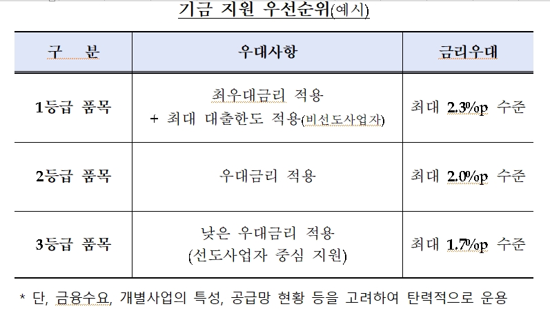 - (1등급 품목) 공급망 중요성이 매우 높은 품목임을 감안, 최우대금리 제공 및 최대 대출한도 적용*을 통해 최우선 지원