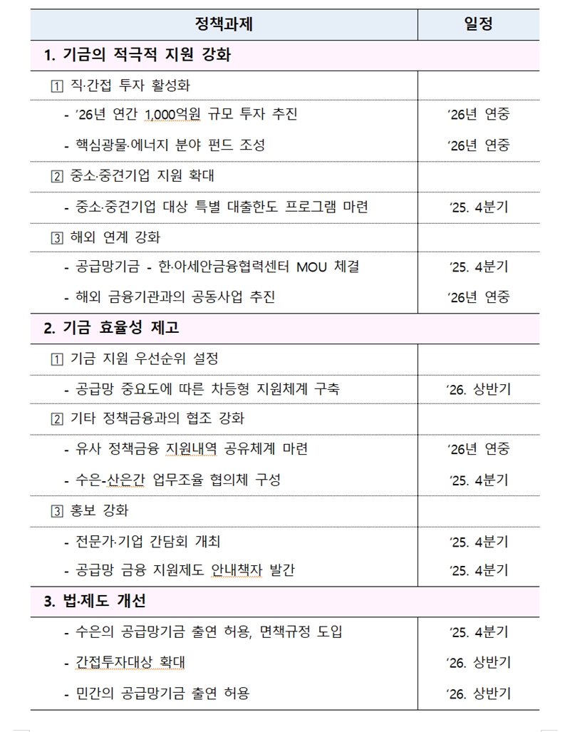 - 기금 재원 마련을 위한 법 개정(공급망법 개정, 9.30일기재위 의결), 중장기 사업 지원 위한 대출·투자기간 연장(10년→20년) 등 추진