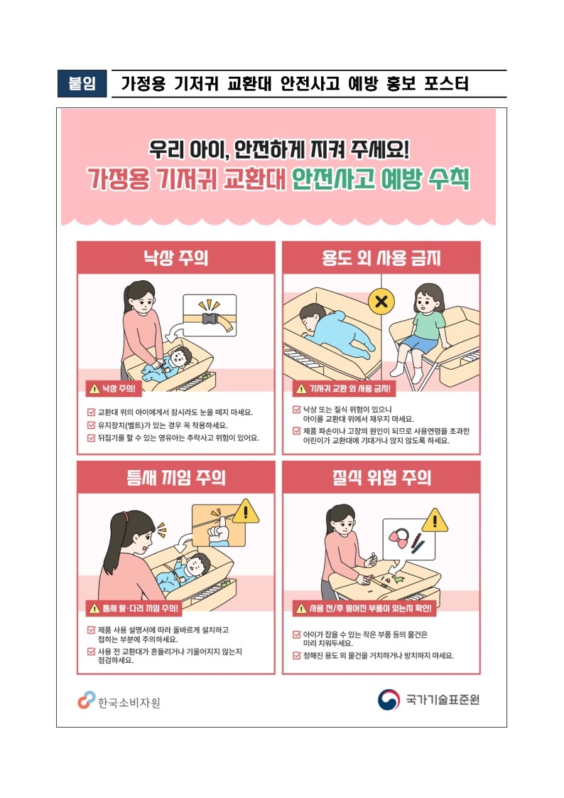 산업통상부 국가기술표준원(원장 김대자, 이하 국표원)과 한국소비자원(원장 윤수현, 이하 소비자원)이 가정용 기저귀 교환대를 안전사고 예방 수칙을 안내하는 홍보 캠페인을 실시한다.