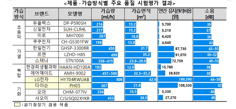 가습방식별로 초음파식은 미로(MH7000)가 267ml/h, 가열식은 르젠(LZHD-H85)이 499ml/h, 복합식은 LG전자(HY704RWUAB)가 606ml/h, 기화식은 샤오미(CJSJSQ02 XYKR)가 433ml/h로 가습량이 가장 많았다.