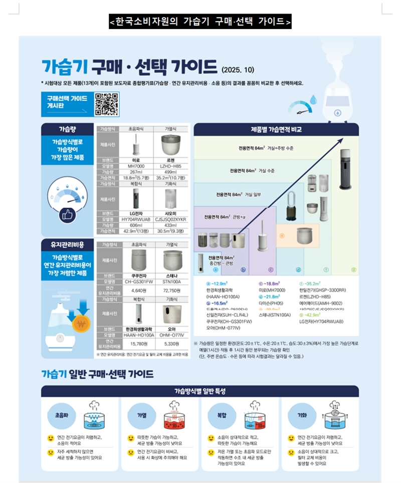 난방으로 인해 실내 건조도가 높아지는 가을·겨울철이 다가옴에 따라 가습기에 대한 소비자의 관심도 높아지고 있다. 이에 한국소비자원(원장 윤수현)은 가습기 13개 제품*의 품질(가습량·가습면적·소음 등), 경제성(연간 유지관리비용 등), 안전성 등을 시험평가했다. 그 결과, 제품·가습방식에 따라 가습량·유지관리비용·소음 등 주요 성능에 차이가 있어 구매 전 사용공간·목적에 맞는 제품인지 확인이 필요했다.
