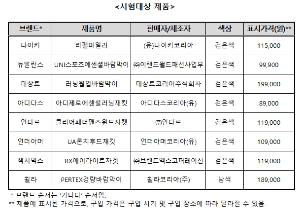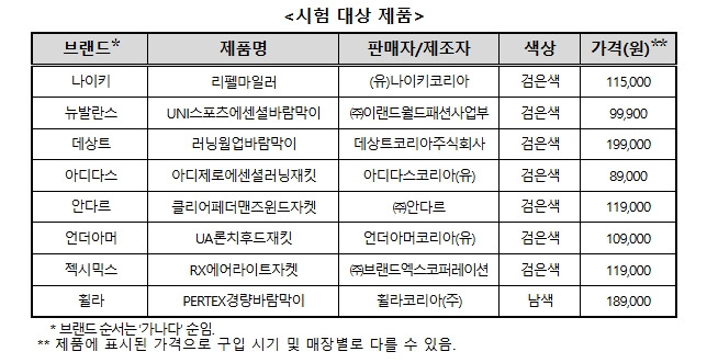 최근 젊은 층을 중심으로 달리기 운동과 러닝 코어(Running Core)* 패션이 유행하면서 러닝 의류에 대한 관심이 높아지고 있다. 한국소비자원(원장 윤수현)은 소비자 선호도가 높은 스포츠 브랜드의 러닝 재킷 8종(8개 브랜드)을 대상으로 기능성, 내구성, 안전성 등을 시험ㆍ평가했다.