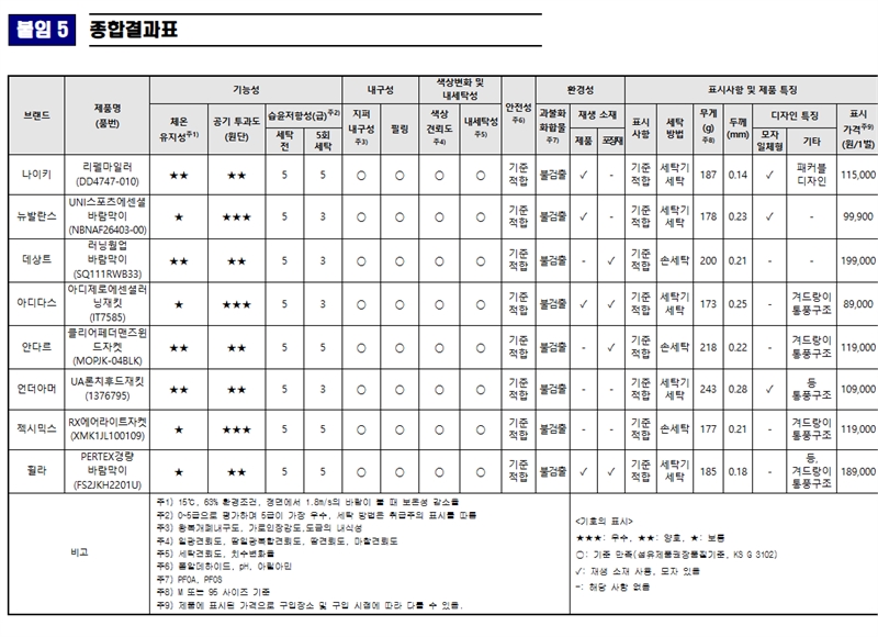 조사 결과, 체온유지성과 공기투과도(통기성)는 제품마다 차이가 있었고, 일부 제품은 표면에서 물을 튕겨내는 성능인 습윤저항성(발수성)이 5회 세탁 후에는 떨어지는 것으로 확인되었다.