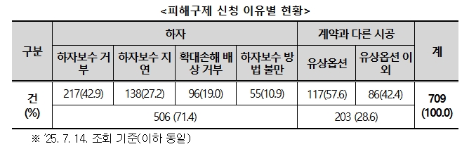 신청 이유로는 ‘하자’ 관련이 71.4%(506건)로 다수를 차지했고, ‘계약과 다르게 시공한 경우’가 28.6%(203건)였다.