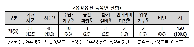 유상옵션 피해에서 확인된 120개의 품목을 분석한 결과, 에어컨‧식기세척기 등 ‘가전제품’이 42.5%(51개)로 가장 많았다. 계약과 다른 제품으로 변경되거나, 계약 당시 최신형 모델이 설치될 거라는 분양직원의 설명과 달리 구형 모델이 설치되는 등의 사례가 대표적이었다.