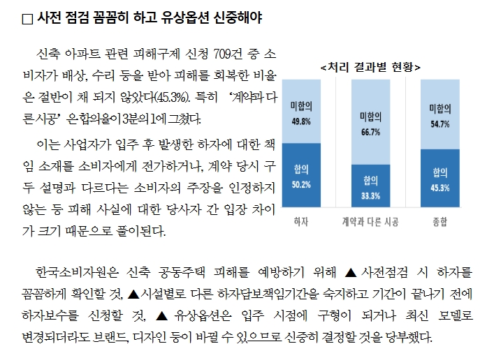 최근 건축 원가 상승, 자재 수급 불안정으로 인해 아파트 등 신축 공동주택의 시공 품질이 저하되면서 하자 불만이 늘고 있다. 또한 당초 계약한 내용이 제대로 이행되지 않는 사례도 많아 소비자들의 각별한 주의가 요구된다.