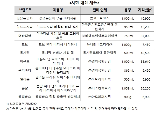 바디워시는 피부에 쌓이는 피지나 먼지 등의 노폐물을 제거하기 위해 사용하는 대표적인 세정제품이다. 한국소비자원(원장 윤수현)은 소비자 선호도가 높은 바디워시 10개 제품에 대해 세정력, 사용감, 안전성, 환경성을 시험‧평가했다.