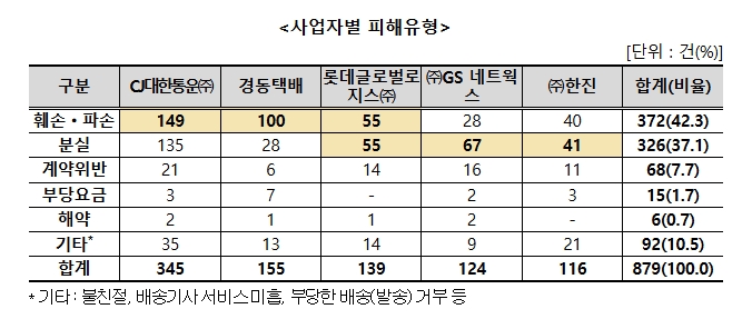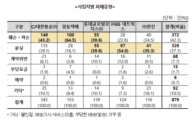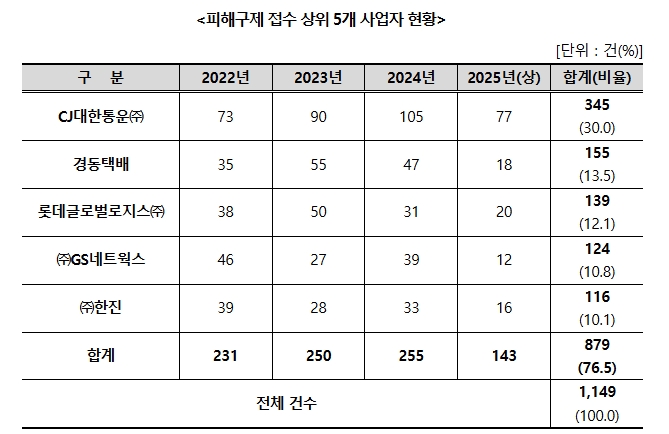 피해 접수 상위 5개 사업자 중 CJ대한통운㈜이 30.0%(345건)로 가장 많았고, 경동택배 13.5%(155건), 롯데글로벌로지스㈜ 12.1%(139건), ㈜GS네트웍스 10.8%(124건), ㈜한진 10.1%(116건) 순으로 뒤를 이었다.