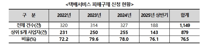 최근 3년간(’22년~’25년 6월) 한국소비자원에 접수된 택배 관련 피해구제 신청은 총 1,149건으로 매년 300건 이상 발생하고 있다. 이 가운데 76.5%(879건)가 5개 사업자*를 대상으로 접수되어 소비자의 주의와 함께 택배 사업자들의 개선이 요구된다.