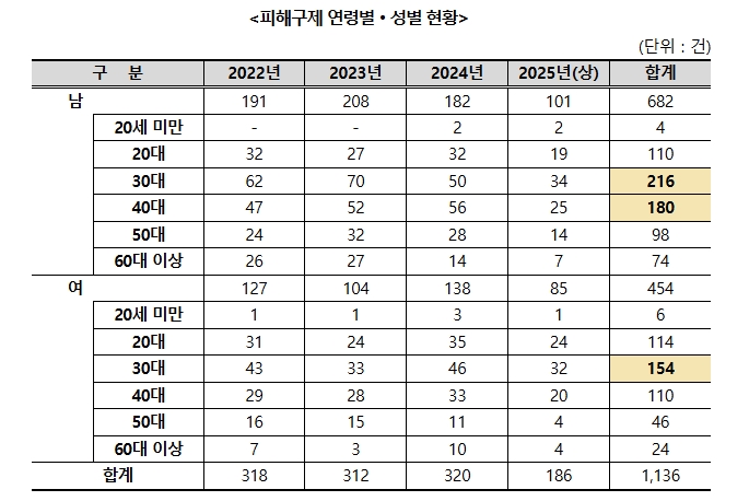 ㅇ (연령별‧성별) 30대 남성이 19.0%(216건)으로 가장 많았고, 40대 남성 15.8%(180건), 30대 여성 13.6%(154건) 순으로 나타남.
