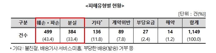 피해유형을 살펴보면, ‘훼손·파손’이 42.3%(372건), ‘분실’이 37.1%(326건)으로 대다수를 차지했다. 특히, 훼손·파손이 발생했음에도 배상을 거부하거나 분실 사고 이후 배상이 지연되는 사례가 많아 개선이 필요하다.