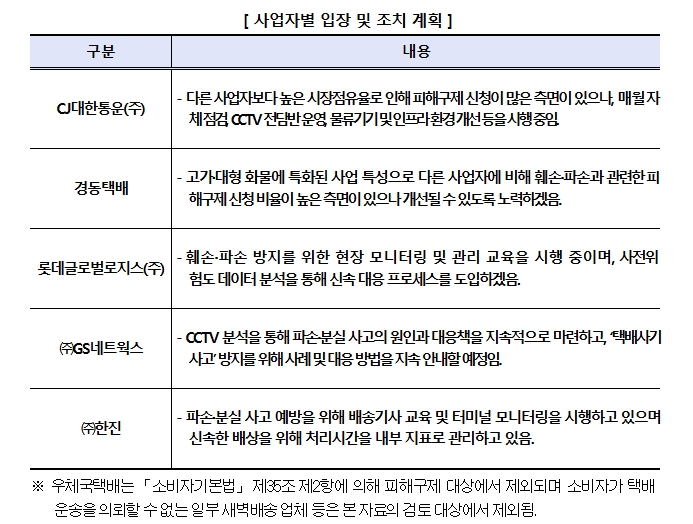 이에 따라 택배 사업자들은 배상 절차를 신속하게 진행하고 현장에서 특약에 대한 고지가 충실히 이뤄질 수 있도록 교육 및 관리를 강화하는 등 소비자분쟁 예방 노력을 강화하기로 했으며, 편의점 사업자들은 각 매장에 실물 운송장 확인 등 택배 사기 주의사항을 공유하기로 했다.