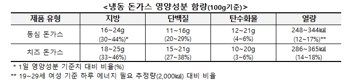 냉동 돈가스(100g 기준)의 지방 함량은 등심 돈가스가 16~24g, 치즈 돈가스가 18~25g이었고, 단백질 함량은 각각 11~16g, 15~21g 수준으로 나타났다.