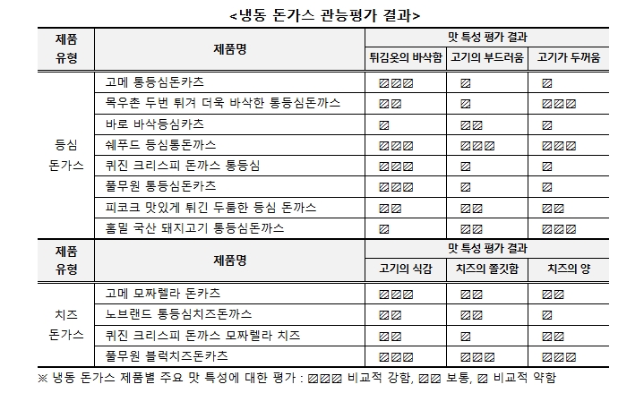 등심 돈가스의 `튀김옷의 바삭함, 고기의 부드러움, 고기의 두꺼움' 등의 항목에 대해 평가한 결과 `쉐푸드 등심통돈까스'(롯데웰푸드㈜) 제품이 상대적으로 높은 평가를 받았다.