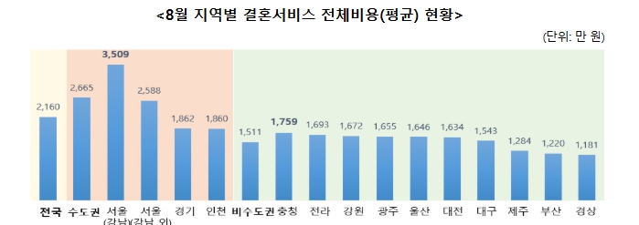 ‘수도권’의 결혼서비스 전체비용은 2,665만 원으로, ‘비수도권’(1,511만 원)보다 1,154만 원 비쌌다. 수도권 지역 중에서는 ‘서울(강남)’이 3,509만 원으로 가장 높았고, ‘인천’이 1,860만 원으로 가장 낮았다. 비수도권에서는 ‘충청’이 1,759만 원으로 가장 높았고 ‘경상’이 1,181만 원으로 가장 낮았다.