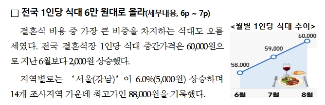 한국소비자원(원장 윤수현)이 전국 14개 지역 결혼서비스 업체 504개사를 조사한 결과, 8월 결혼서비스 전체비용*은 평균 2,160만 원이었으며, 최근 3개월 동안 상승 추세**인 것으로 나타났다. 결혼식 비용에서 가장 큰 비중을 차지하는 식대의 중간가격은 6만 원을 넘어섰고, 특히 대관료가 지난 6월 대비 16.7%로 크게 올랐다.