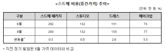 스드메(스튜디오·드레스·메이크업) 패키지와 개별 서비스의 중간가격은 지난 6월과 비교해 큰 차이가 없는 것으로 조사됐다. 스튜디오는 가격변동이 없이 132만 원으로 동일했으며, 드레스는 2.6%(4만 원) 오른 155만 원, 메이크업은 5.5%(4만 원) 오른 77만 원으로 집계돼 약간의 오름세였다.