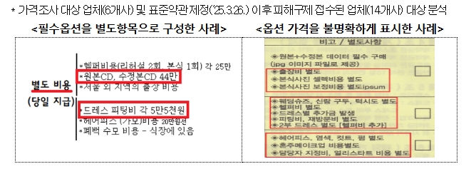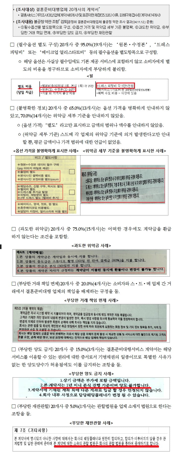 결혼준비대행 업체 20개사*의 계약서를 수집하여 분석한 결과, 모든 업체에서 불공정한 약관 조항이 확인되었다. 19개사(95%)는 ‘사진 파일 구입비’, ‘드레스 피팅비’ 등 필수옵션을 기본 제공 서비스가 아닌 별도항목으로 구성하고 있었고, 13개사(65%)는 옵션 가격을 구체적으로 표시하지 않고 ‘별도’로만 표기했다.