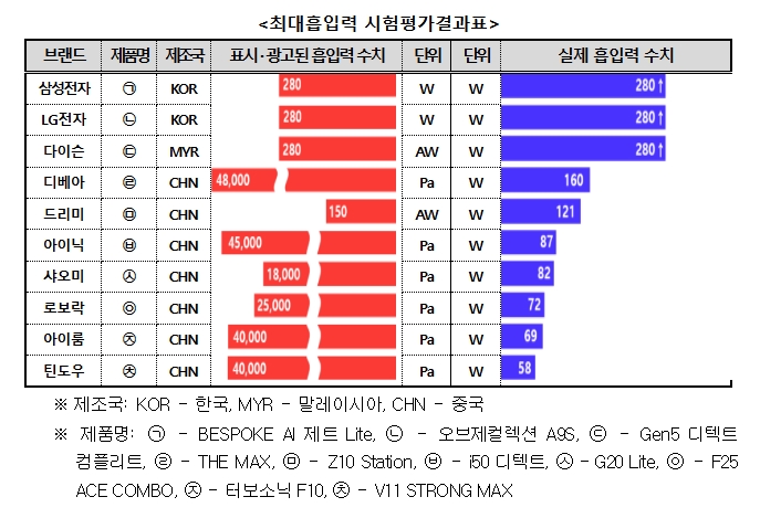 시험대상 10개 제품 모두 핵심 성능으로 흡입력을 표시·광고하고 있었으나 제품별로 흡입력을 표시하는 단위가 달라 소비자가 객관적으로 제품의 성능을 비교하기 어려웠다.