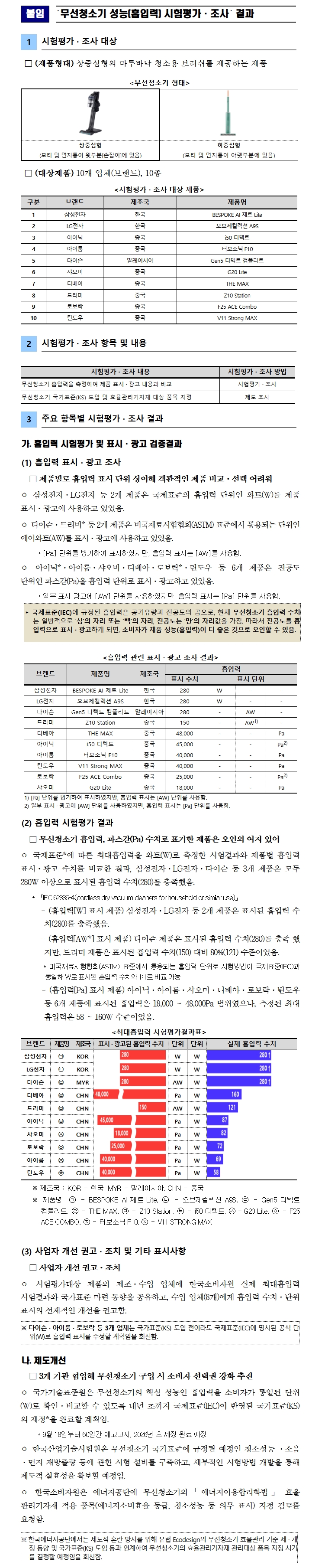 아울러 한국소비자원은 한국에너지공단에 무선청소기의 효율관리기자재 대상 품목(에너지소비효율등급·청소성능 등 의무 표시) 지정 검토를 요청*했다.