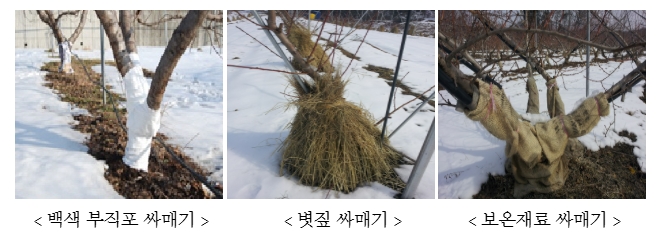 □ 복숭아‧포도 등 저온에 취약한 과수는 나무 밑둥을 보온자재로 싸매주거나 묻어주기