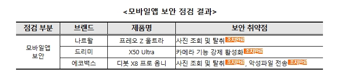 모바일앱 보안 점검 결과, 나르왈, 드리미, 에코백스 3개 제품은 사용자 인증 절차가 미비해 불법적인 접근이나 조작 가능성이 있었다. 집 내부를 촬영한 사진이 외부로 노출되거나 카메라 기능이 강제로 활성화되는 등 사생활이 노출될 수 있는 보안 취약점이 확인됐다.