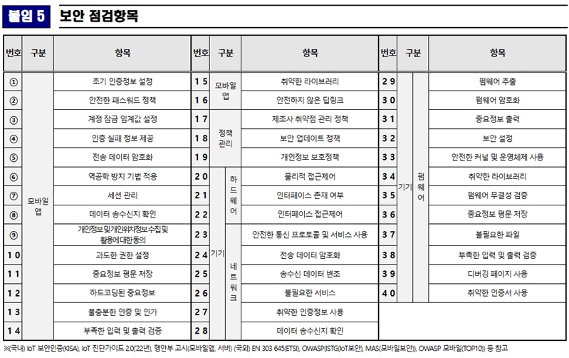 한국소비자원은 조사대상 모든 사업자에게 모바일앱 인증 절차, 하드웨어 보호, 펌웨어 보안 등 부족한 부분에 대해 보안성 향상을 위한 조치를 권고했다.