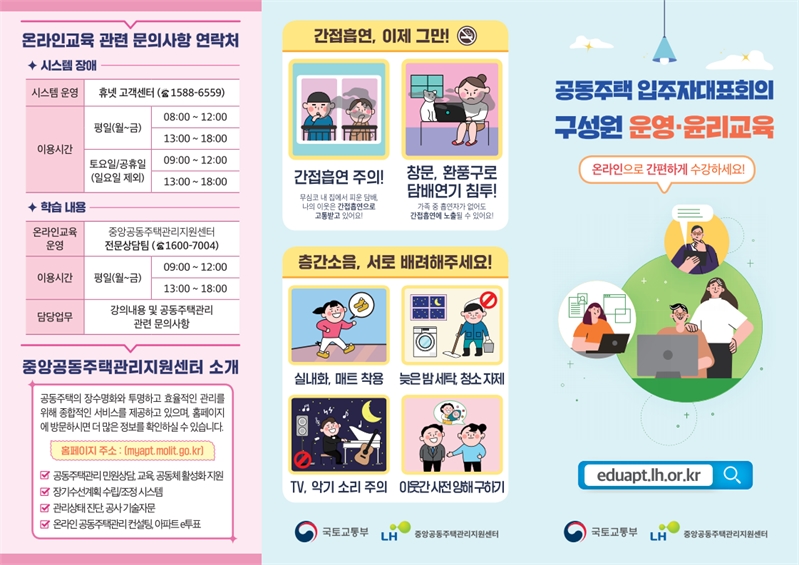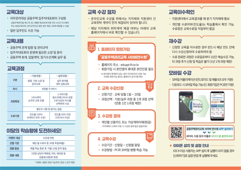 1. 평소 우리 시 행정 발전에 적극적으로 협조하여 주셔서 고맙습니다. 2.「공동주택관리법」제17조에는 입주자대표회의 구성원은 매년 4시간 이상교육을 받도록 의무화 되어 있으며,「세종특별자치시 관리규약 준칙」제20조에는 입주자대표회의 운영 및 윤리교육을 매년 이수하지 않을 경우를 동별 대표자와 임원의 해임사유로 규정하고 있습니다. 3. 이에 따라, 우리 시에서는 입주자대표회의 구성원분들께서 무료로 법정 의무교육을 받으실 수 있도록 한국토지주택공사(LH)에 위탁하여 온라인 교육을 제공하고 있으니, 관내 입주자대표회의 및 관리주체에서는 구성원분들의 교육 이수와 함께 아래의 교육내용을 게시판, 홈페이지 등을 통해 홍보해 주시기 바랍니다. 4. 아울러, 세종시아파트입주자대표회의연합회와 대한주택관리사협회 세종시회에는 회원들께서 본 내용을 안내 받으실 수 있도록 별도의 홍보 부탁드리겠습니다. < 온라인 교육 개요> 가. 홈페이지 : 공동주택관리교육 사이버연수원(http://eduapt.lh.or.kr) 나. 매월 강의 수강신청 기간 : 교육당월 1일~교육당월 20일까지 다. 수강시간 : 학습기간(매월1일~말일)내 과정별 4시간 이상 라. 교육대상 : 입주자대표회의 구성원 및 입주자 등(제한없음) 마. 교육과정 개편내용 : 붙임 안내문 참조 * 장기수선계획서 수립 또는 조정 시, 중앙공동주택관리지원센터(LH) 홈페이지 내 「공동주택 유지관리 정보시스템」을 적극 활용하여 주시기 바랍니다. * 담당자 박권제(☎:044-300-5936, 팩스:044-300-5919, 메일virtualspace@korea.kr) * 붙임 홍보용 안내문 필요시 확인 방법안내 (세종시청 홈페이지 – 분야별정보 – 공동주택생활지원센터 공지사항에서 확인)