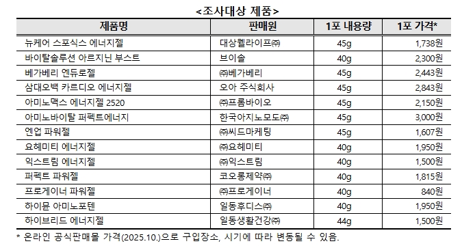 조사대상 에너지 스틱 제품 1포당 가격은 840~3,000원으로 제품 간 최대 3.6배 차이가 났다. `아미노바이탈 퍼펙트 에너지(한국아지노모도㈜)' 제품이 3,000원으로 가장 비싸고, `프로게이너 파워젤(㈜프로게이너)' 제품이 840원으로 가장 저렴했다.